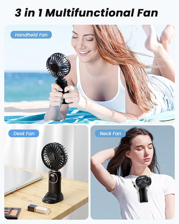 coldSky Portable Handheld Fan, 4000mAh Battery Operated 3 in 1 Multifunction Personal Travel Fans with Digital Display, 90ยฐ Foldable Desk Fan with Base, 5 Speed Lash Fan for Makeup/Office (Black)