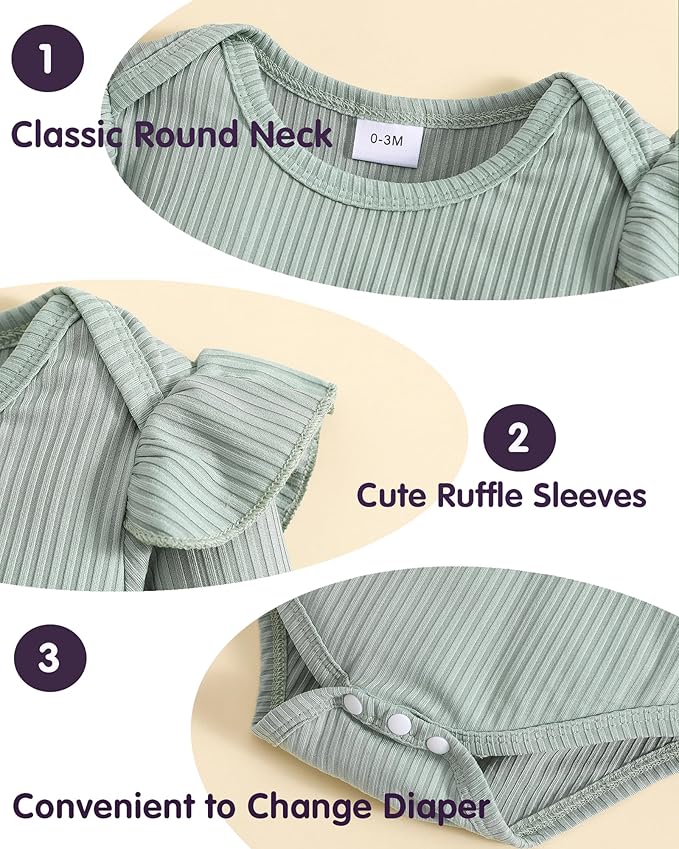 - Fashionable Classic Design:Adorable flower ruffle romper top/pant + solid pant/shirt matching cute bow knot headband and hat express great love from family.Convenient Snap closure for easy diaper changes.
