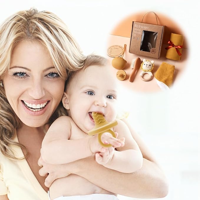 - UNIQUE BABY GIFT:Every gift set Bundled in a tasteful baby GIFT BOX suitcase, our baby gift box is an ideal present for various occasions such as birthdays, baby shower gift, baby gifts, gender reveal, baby's first Christmas, and baby's first photo shoot. made of natural materal, such as : organic beech wood, food grade silicone and cotton, baby can touch them without worrying about safety