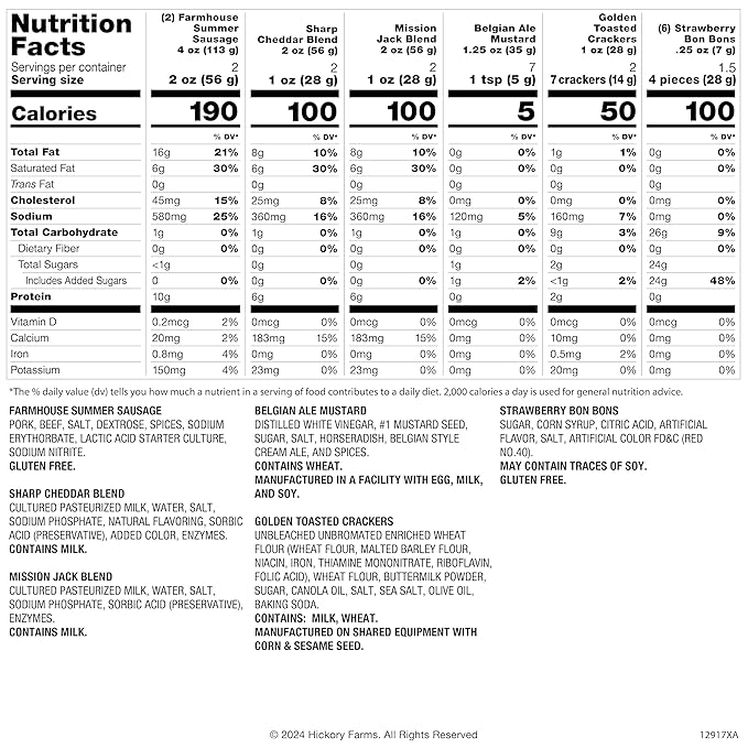 - Gourmet Condiments: Crackers & Sweets - 1.25 oz Belgian Ale Mustard, 1 oz Golden Toasted Crackers, (6) 0.25 oz Strawberry Bon Bons