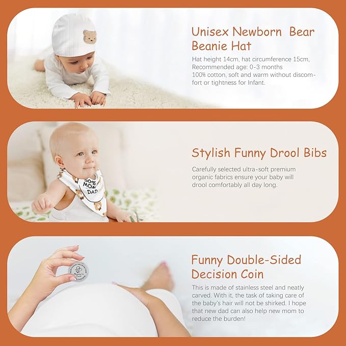 - 【Stand Out Among The Dazzling Array Of Pregnancy Gifts Basket! 】A bear theme makes this gift extra cute! It includes the baby's necessities - beanie hat, onesie, bibs, baby mittens, funny socks; as well as exclusive insulation tumbler and a decision coin for mom and dad. Still thinking which one to buy as a baby shower gifts? Don't hesitate, this will be the perfect new mom gifts for women that you can express your blessings.