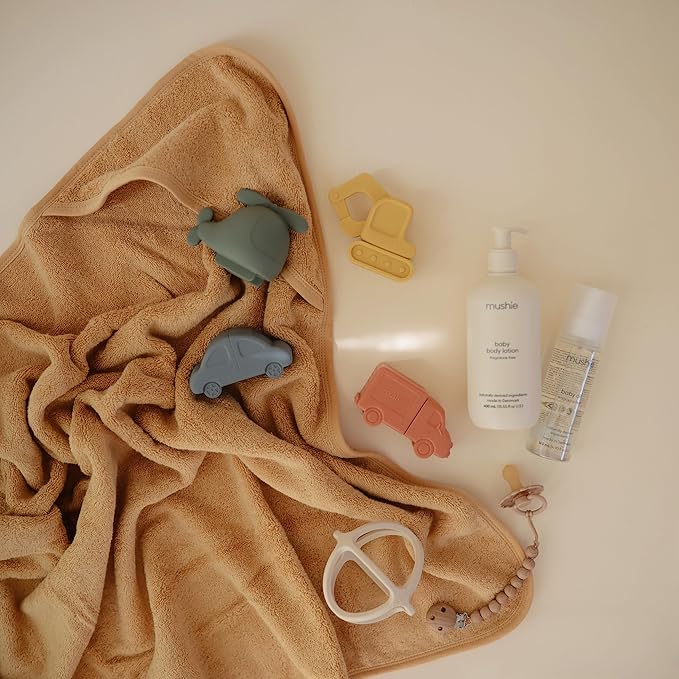 - Make a Splash: Let your child's imagination travel far and wide with the mushie bath play set that includes a helicopter, car, truck and excavator.