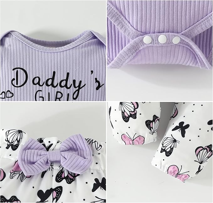 - Cute newborn girl clothes: ribbed ruffle romper with "Daddy's Girl Mommy's World" word design, butterfly pants, matching bowknot headband, super fashionable 3pcs baby clothes for girls in Spring Fall Winter.
