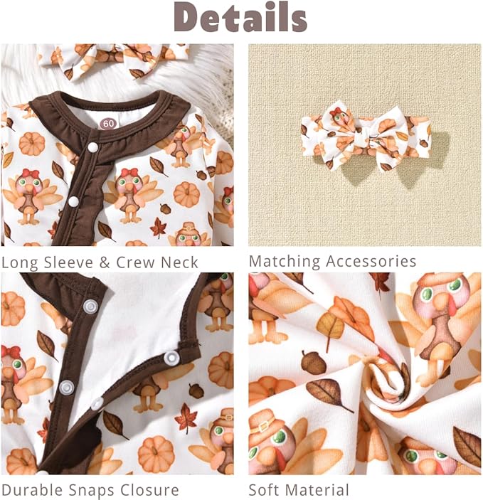 - UNIQUE THANKSGIVING DESIGN: Aalizzwell classic crew neck Thanksgiving romper with different colors. Easy diaper changing with snaps closure. Vintage ruffle sleeve & patchwork design. Matching accessories are included. Different style to choose, it looks especially cute! Every detail is designed for the newborns, giving baby free space to grow up.