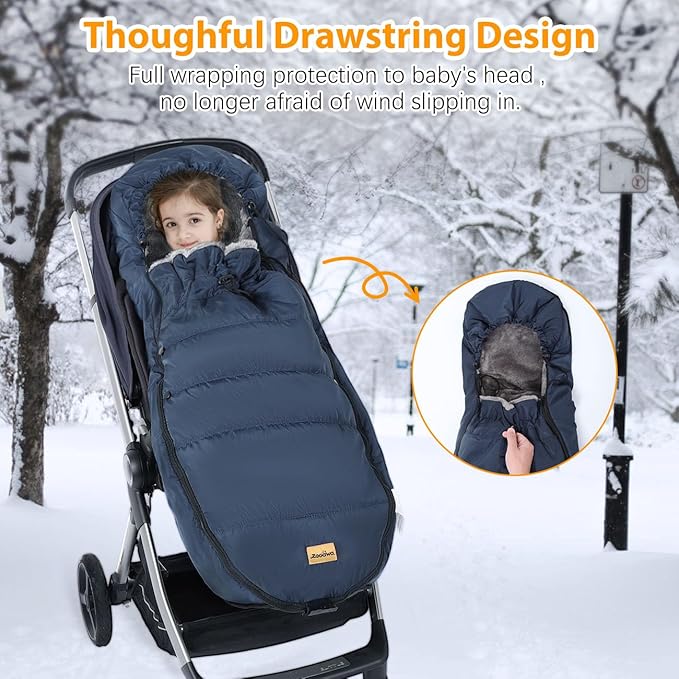 - 【Anti-Cold & Anti-Pinch Design】All zippers are fully covered to prevent snow, wind, or rain from going through winter footmuff and keep baby's chin from getting hurt. Equipped with a drawstring hood, Zooawa stroller footmuff can also block all the intrusion of cold wind and keep your baby's face warm.
