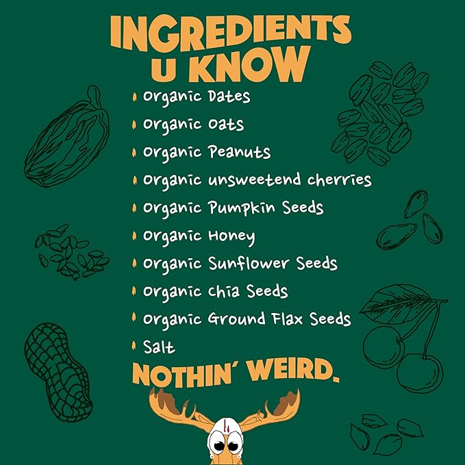 - Our High-Quality Ingredients: Organic Oats, Organic Dates, Organic Peanuts, Organic Cherries, Organic Pumpkin Seeds, Organic Honey, Organic Chia Seeds, Organic Flax Seeds, Organic Sunflower Seeds, Salt.