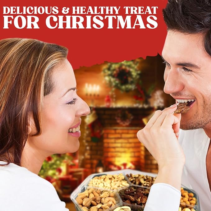 - NUTS PACKED WITH FRESH, FLAVORFUL, NUTRITIOUS NUTS: This dried nut care package is going to be a massive hit. This 7 section platter contains a variety of mouthwatering nuts; all beautifully presented in a high-end gift box. christmas gift basket.