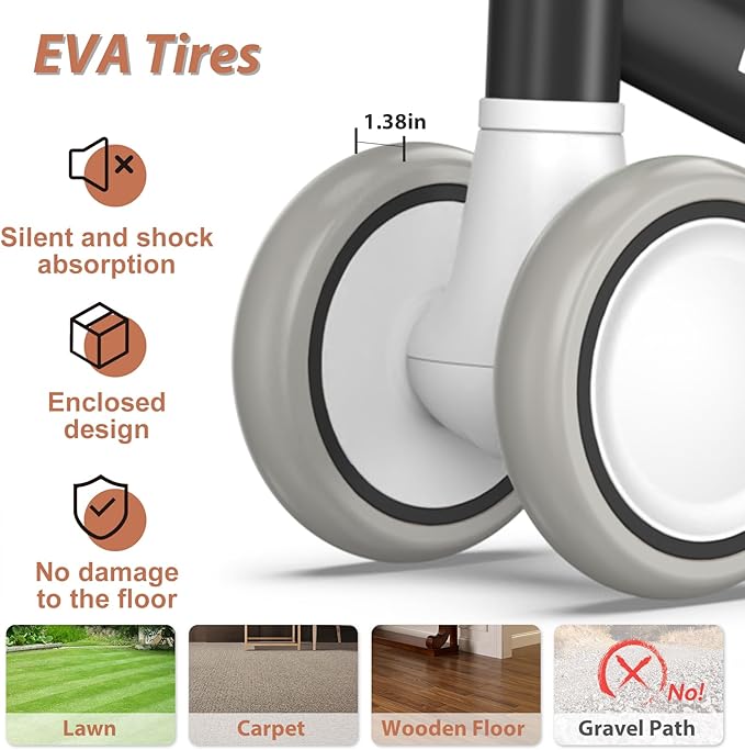 - BABY-FRIENDLY DESIGN: Tailored for baby's comfort and growth in mind. The adjustable PU seat, ranging from 9.7" to 11", grows with baby. The rubber bike handles are tear and chew-resistant, while the EVA tires offer a smooth ride and significantly reduce noise for a peaceful ride