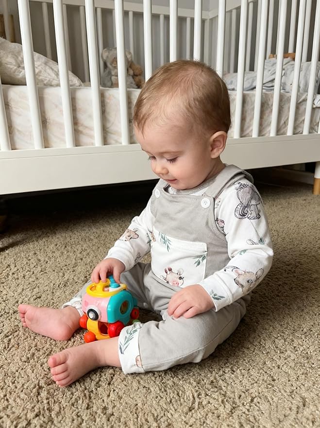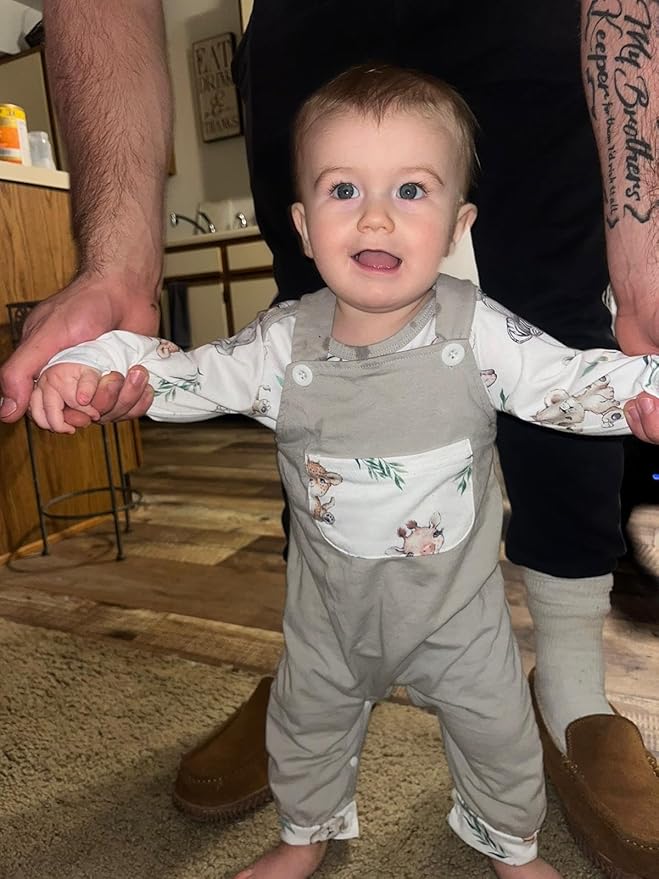 - đ°ăCute DesignăThe baby boy outfits features expandable shoulders, bringing more stretching space for the baby. The snap design in the crotch is convenient for mom to change clothes and diapers for the baby. Animal print and plaid patterns keep your baby boy looking super cute.