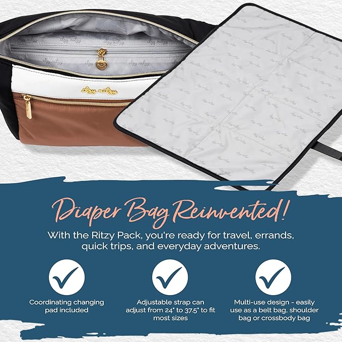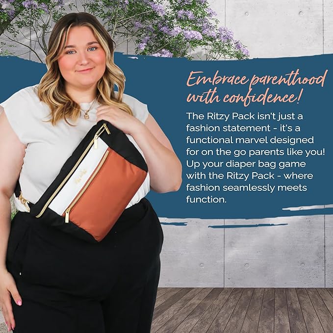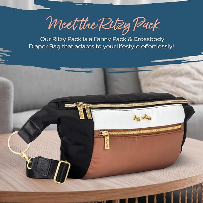 - ELEVATE YOUR STYLE: The Ritzy Pack's adjustable strap, extending from 24" to 37.5", empowers you to curate your own fashion statement. Whether you opt for the classic fanny pack diaper bag, chic belt bag, or modern crossbody diaper bag, your personalized style is always at arm's length.