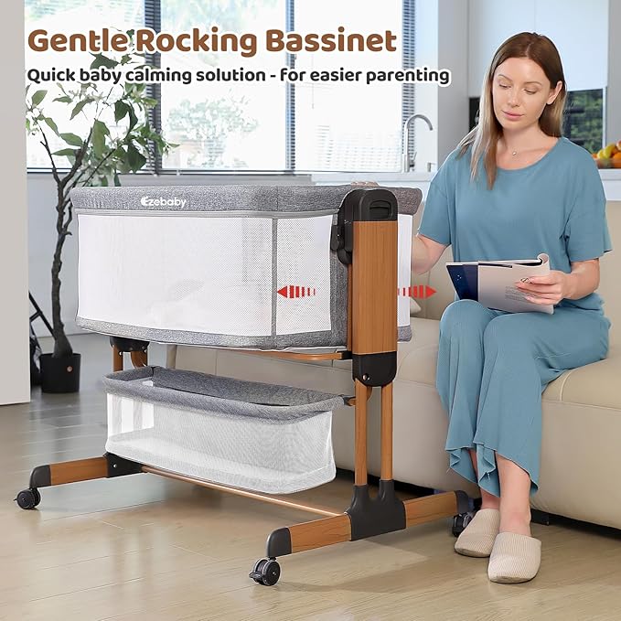 Ezebaby 3-in-1 Rocking Bassinet for Baby Adjustable Baby Bassinets Bedside Sleeper with Wheels Storage Basket and Mesh Sides for Newborn Infant
