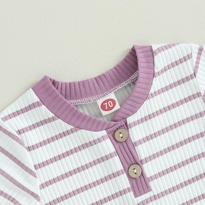 • Design: Neutral baby clothes. Solid color/ striped, v-neck and button design, snap closure for easier changing diapers, knit ribbed long sleeve romper top matching with solid elastic waistband drawstring long pants. Simple yet stylish. Perfect for spring/fall/winter.