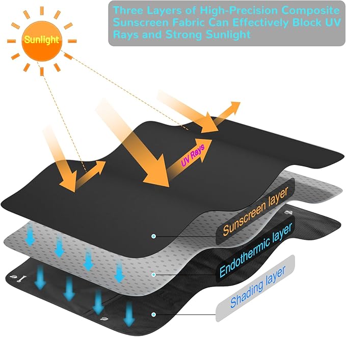- Block 99% Sun Glare and UV Rays:Our car window shades are made of 3-layer composite fabric, very thick and soft. Opaque and fully shading, it can effectively block 99% of the sun, heat and UV rays, and keep you and your family cool and comfortable all the time. Only for rear side windows when driving! Please do not use it for front windows to block the driver's sight.
