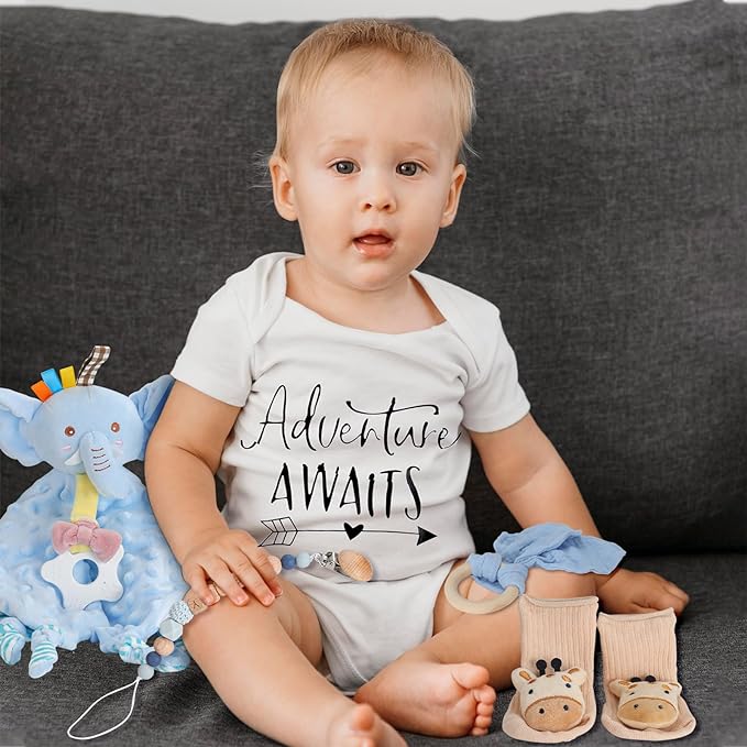 - 【Baby Shower Gifts】Cute blue elephant soothing towel is soft and can make sound to attract baby's attention. Baby socks with non-slip design help baby learn to walk with more confidence. The quality chain keeps baby's pacifier close at all times. There is also a Birth Announcement Sign, it will be a nice photo prop and keepsake for memories to look back forever.