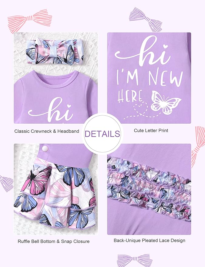- 💜🦋Cute Baby Girl Clothes: This newborn baby girl clothes--"hi I'm new here" newborn outfit girl features classic round neck design, a combination of letter print and butterfly pattern, the cuffs of long sleeve baby girl romper are designed with ruffle windproof cuffs, the new design of onesie for baby girl jumpsuit flare bell bottom pants legs keeps your baby fashionable, warm, and cute in autumn and winter.