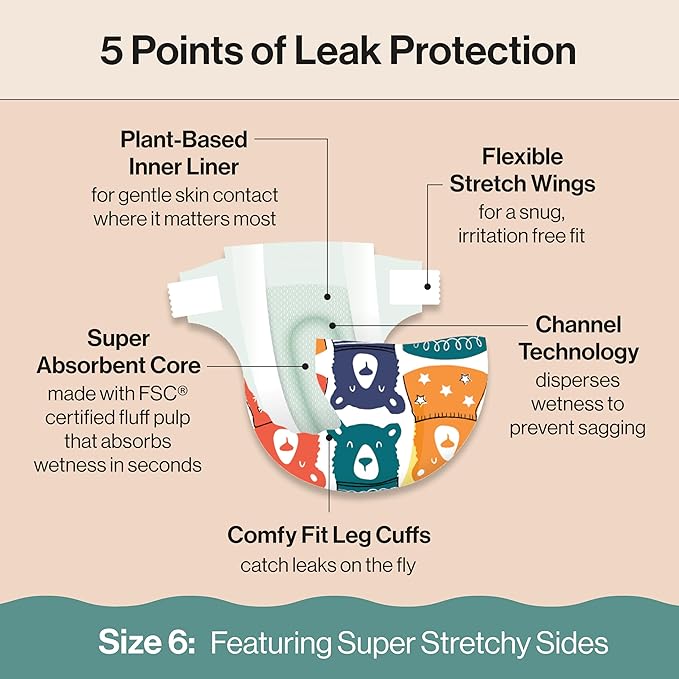 The Honest Company Clean Conscious Diapers for Delicate Skin | Up to 100% Leakproof | Hypoallergenic, Fragrance Free | Gender Neutral | Super Club Box, Size 6 (35+ lbs), 68 Count (Prints May Vary)