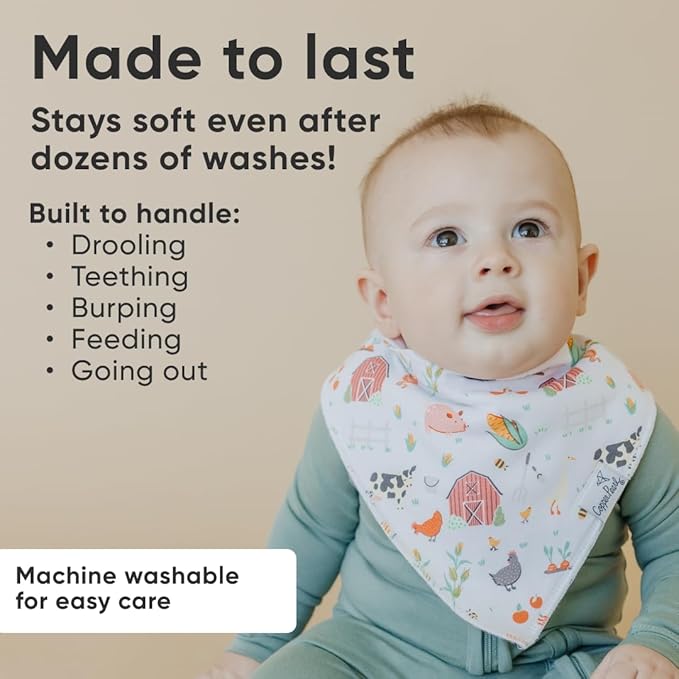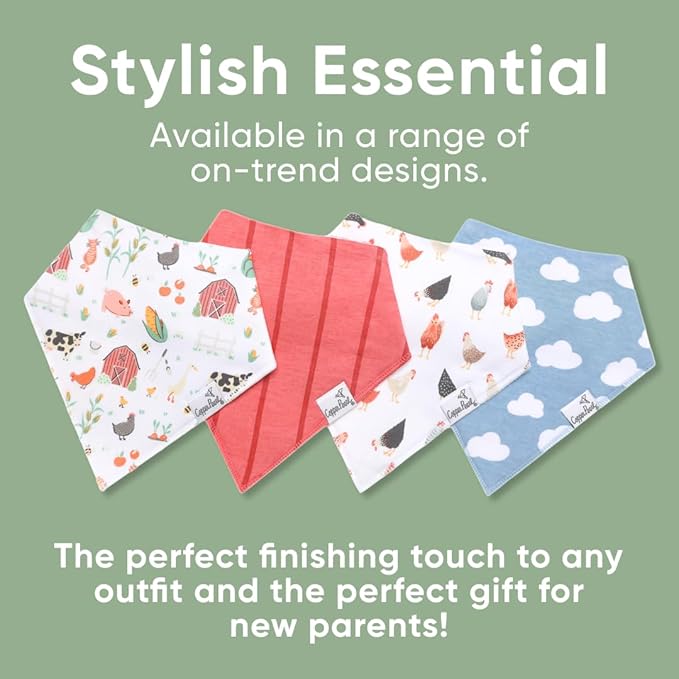 Copper Pearl 4 Pack Soft Cotton Baby Bibs for Drooling and Teething, Absorbent Drool Bibs for Baby Girl and Boy, Adjustable to Fit Newborns to Toddlers, Tons of Styles (Farmstead)