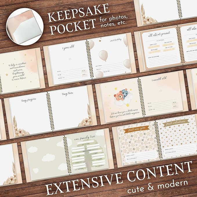 - Perfect Gift for baby shower, easy for busy moms and dads to document baby’s milestones. First 5 Year Baby Book Carefully Designed for Modern Families. Our Baby Memory Book provides ample space to write baby's growth. 12 monthly & 24 Memorable firsts and holidays stickers. Baby Journal with keepsake pocket to hold items (photos, notes, etc). Includes a Beautiful Protective Keepsake Cover.