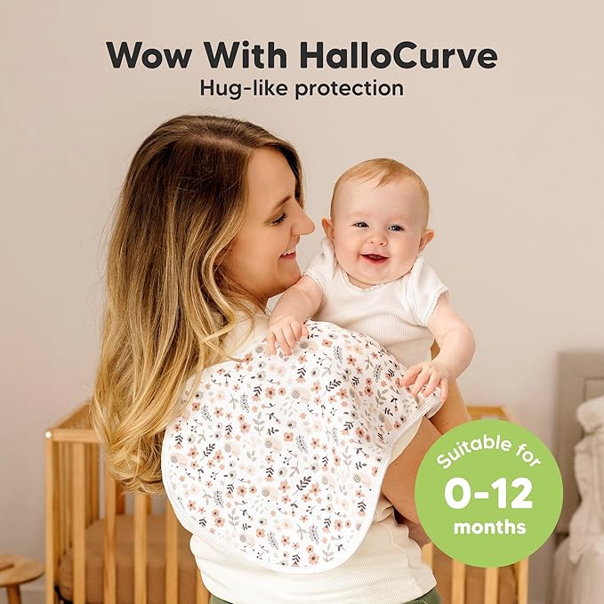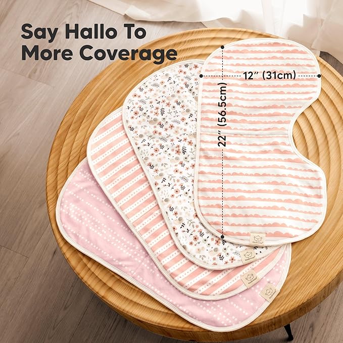 - Hallo to More Coverage - Our organic baby burp cloths for girls and boys, sized at 22" x 12", are extra large and wide to fully cover your shoulders. The unique Hallo Curve provides more coverage & comfort, perfect for spit ups and feeding mishaps.