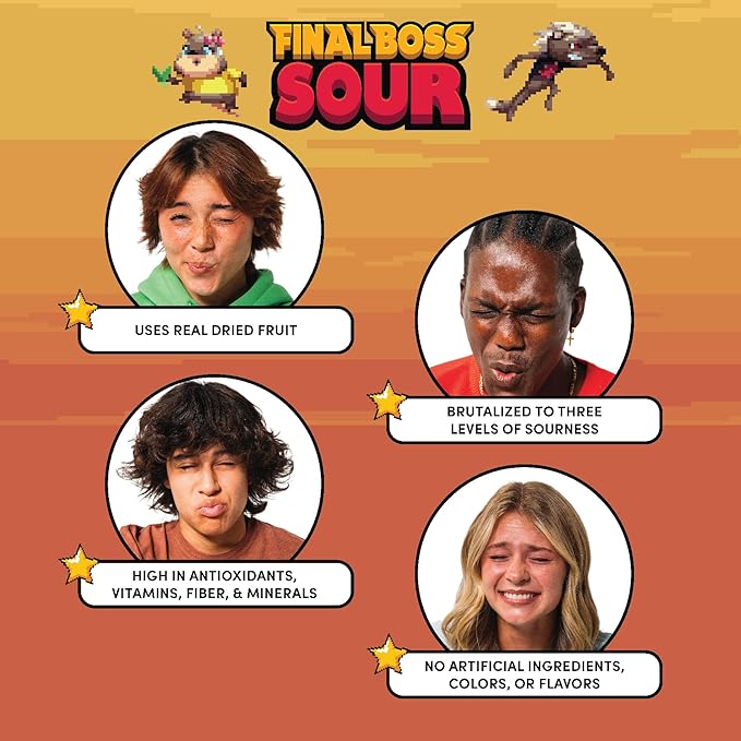 - REAL DRIED FRUIT FOR A NATURAL BURST OF FLAVOR: Final Boss Sour is made using real dried fruit instead of artificial gummies or syrups. That means every bite is packed with authentic fruity flavor and natural sweetness, making it a better alternative to traditional sour candies full of junk ingredients.