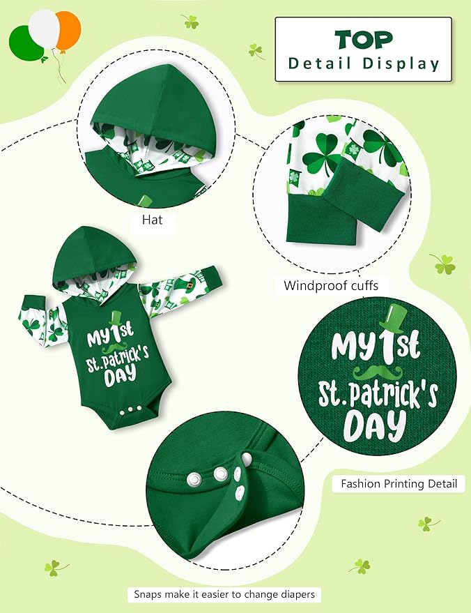 • ☘️Stylish and comfortable: Dress your little boy in this trendy outfit featuring a green hoodie-style top with a hood and a cool "My 1st St Patrick's Day" letter print. The sleeves are adorned with lucky clover patterns, adding a touch of charm. The casual long pants also feature lucky clover patterns for a coordinated look.