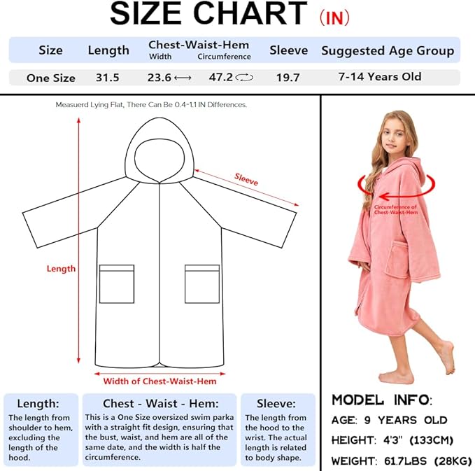 - Big Kids Size: This item is suitable for children aged 7 to 12, regardless of gender. Fits kids' height: 3'9"-5'3"(1.15-1.6m). Length(Shoulder to Hem): 31.5 inches. Width: 23.6 inches.