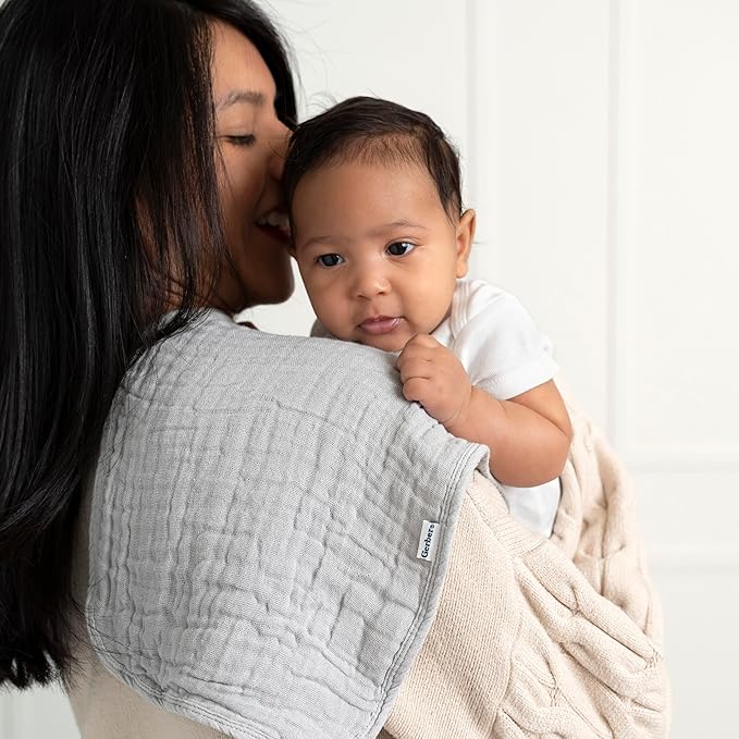 - Five prewashed muslin burpcloths with a mix of patterns and prints