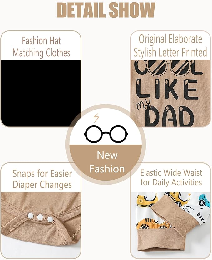 - Unique design of Baby Boy Outfit–Baby boy romper top with botton opening for easy wear . Glasses printed stylish bring impressive and eye-catching feelings . Elastic waistband striped long pants make for easy dressing and bring convenience for movement.It also has a hat for your boy . Your boy will be the handsome one.