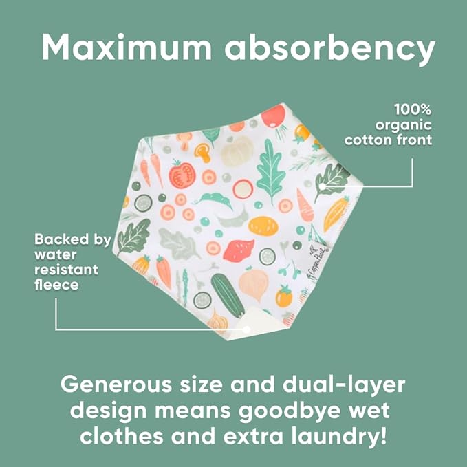 - ABSORBENT COTTON DROOL BIB; These stylish drool bibs are made of 100% absorbent cotton on the front and 100% polyester fleece on the back; The front of the baby bib is a stylish knit fabric and the back is a super soft fleece that keeps your baby completely dry even with the drooliest of babies; Great for teething babies
