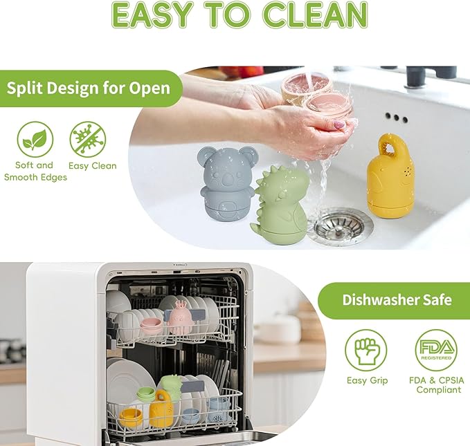 - Easy to Clean & Dishwaher-Safe: Each silicone toys feature a split design - allowing you to open it for deep cleaning and fast drying. Simply place in the dishwasher for quick and easy cleaning. Simply toss in the dishwasher for thorough sanitation after play