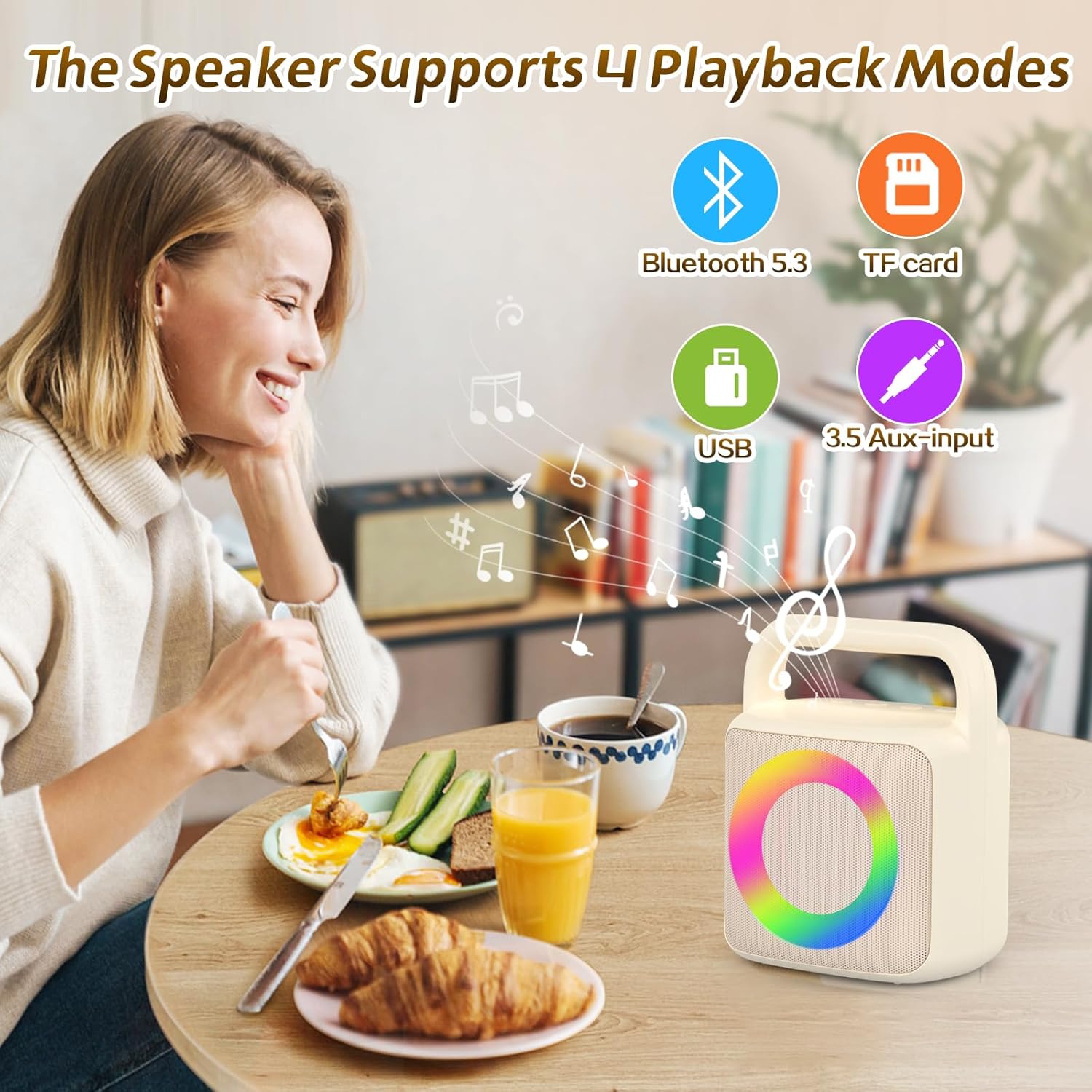 - Colorful Atmasphere lights - The karaoke machine is equipped with colorful lights to creating an immersive and dynamic karaoke experience,and the light can be turned off by longer press the "M" button, and double click to change the 6 light modes.