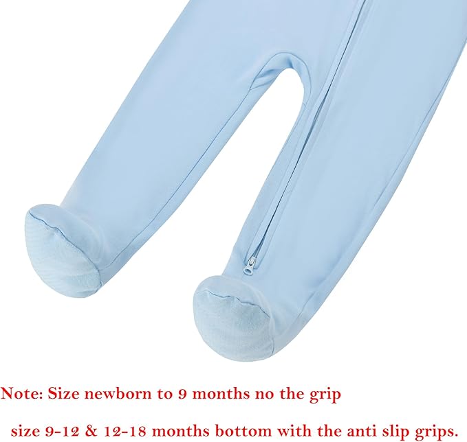 - 【Built-in Mittens and Footed】All sizes design with reversible mitten hand covers to prevent baby from scratching themselves. This 9-12 months baby footie pjs features grip on the feet for extra stability. Great for little baby on the move(size 0-9 months and snap style all size without non-slip grips)