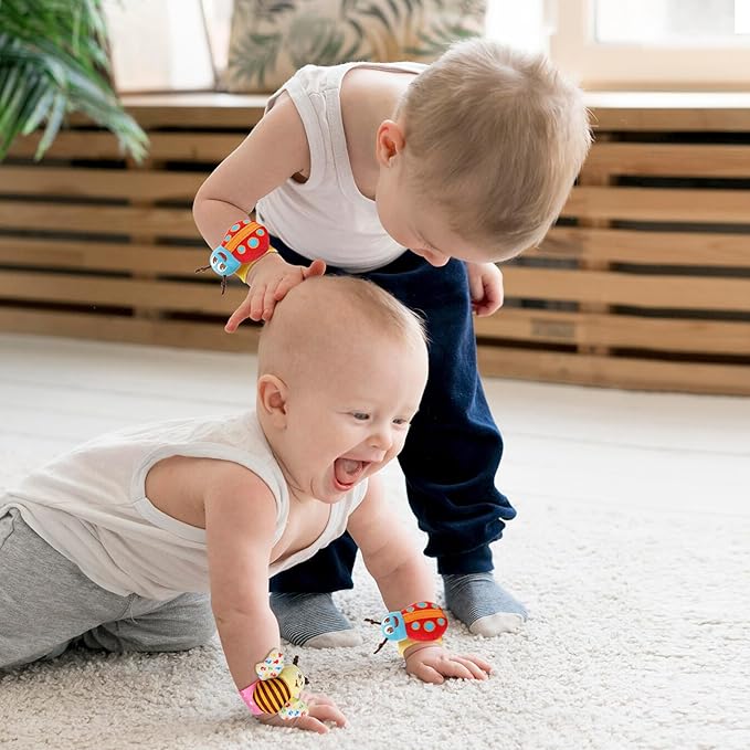 - CUTE DESIGN -- All Wrist Rattles and Foot finder socks have bells inside, the Wrists rattles attach with fabric hook, easy to put on and take off. The wings of Bee and Butterfly were with sound paper, encourage baby to reach and grab.