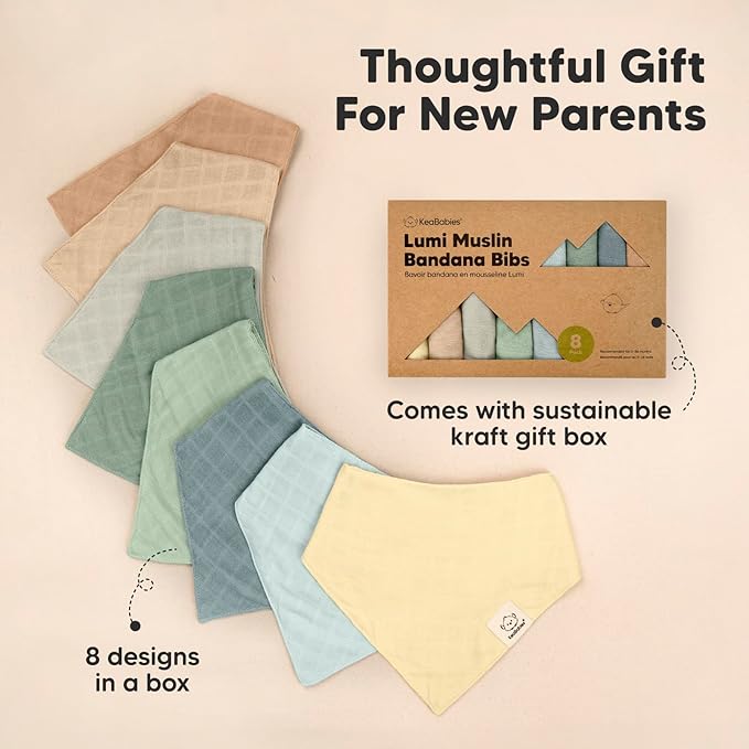 - Ideal Baby Gift - The 8-Pack Lumi Muslin Organic Baby Drool Bibs come beautifully packaged in a sustainable kraft box, making them a cute and thoughtful present for baby shower, baby registry, Christmas, and birthdays.