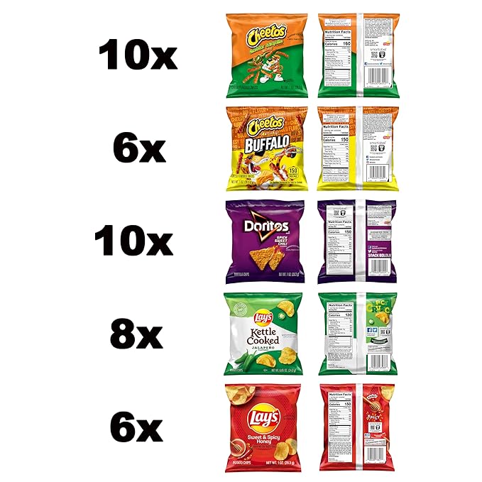 - Includes (10) Cheetos Crunchy Cheddar Jalapeno, (10) Cheetos Crunchy Buffalo, (10) Doritos Spicy Sweet Chili, (8) Lay's Kettle Jalapeno, (6) Lay's Sweet & Spicy Honey