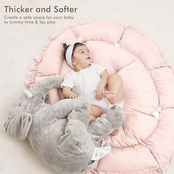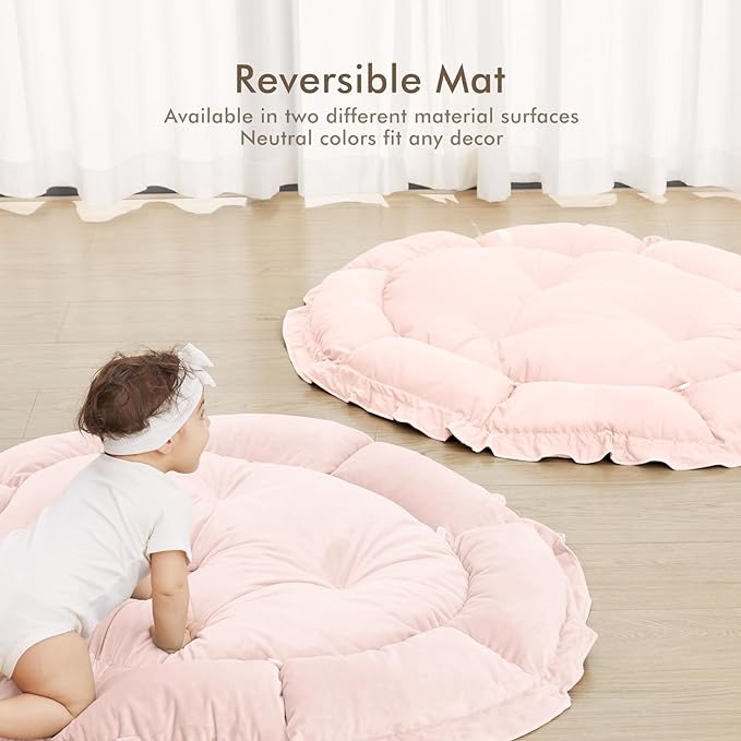 - THICKER & SOFTER: The reversible play mat crafted from premium plush material, offers a fantastic amount of cushion. Its neutral color scheme blends in with your home’s aesthetic so you can keep it out even after playtime is over.