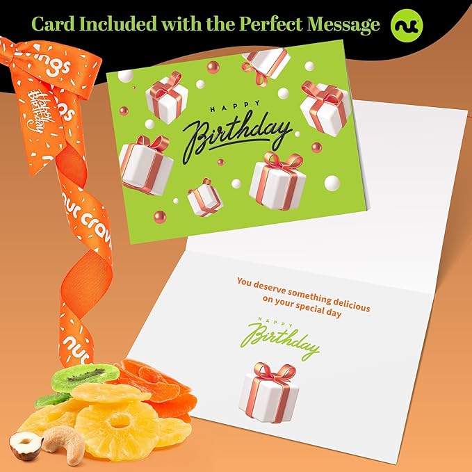NUT CRAVINGS Gourmet Collection - Happy Birthday Treats, Dried Fruit & Mixed Nuts Gift Basket with Bday Ribbon in Reusable Wooden Tray (12 Assortments) Food Arrangement, Healthy Snack, Food Assortments