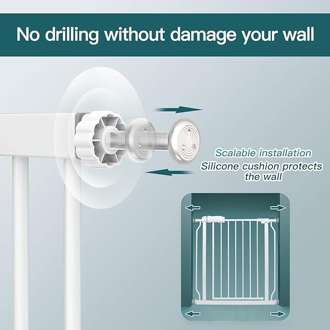 - Easy to install & Unique Matte Design-Our tension indoor safety baby gates extra wide for indoor and outdoor comes with 4 adjustable pressure bolts, which is easy for quick installation: no tools required, no need drilling holes and no damage to your wall.The unique Matte design makes the narrow baby gate and extra wide baby gate more stylish and reduce the scratches.