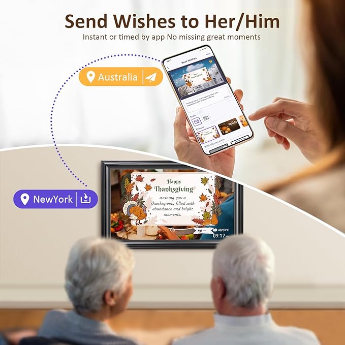 - 【Perfect Gift】Perfect for Mother's Day, Father's Day, Christmas, Wedding or Family Holiday. With a removable stand, you can place it in both landscape and portrait mode. The wall mount hole on the back also allows users to mount it to the wall. It has multiple functions such as slideshow photos/videos, clock and weather, sleep mode, adjustable brightness, and send wishes. It helps to maintain close relationships with family members. This is the perfect gift for older people to connect with the younger generation.