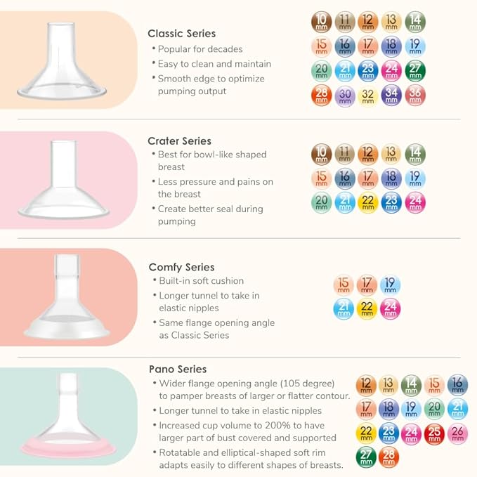 - Flange opening is 105 degree, more suitable for mothers with large breasts or flatter contour breasts; Soft and flexible edge for more comforts; Larger cup size for more covered area of breasts during pumping; elliptical-shaped design to rorate and adapt for comfortable pumping.