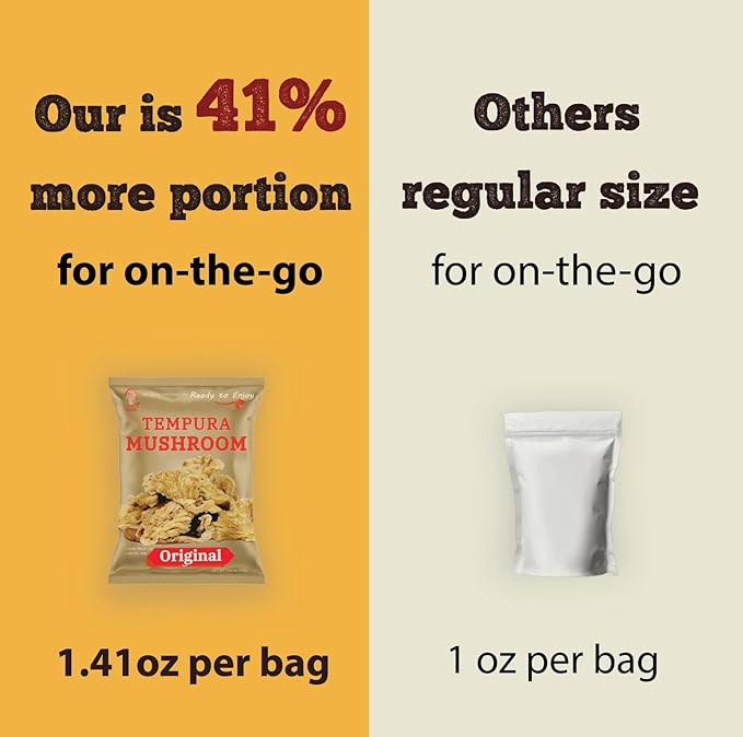 - PACKAGE SIZE: Available in bulk options of 6, and 12 bags, each containing convenient individually bag servings (1.41 oz) of crunchy tempura oyster mushroom chips. No cooking required.