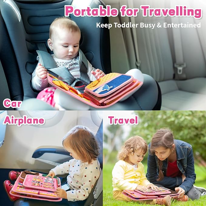 - TRAVEL ESSENTIALS: Measuring 11.1 x 8.6 inches with a handle design, this busy board travel toy is lightweight and compact for young children to carry. It is a quiet choice for airplane or car travel, allowing your child to enjoy happy leisure time on the go. Ideal for a toddler busy board ages 2-4 or a Montessori book for 2-3.