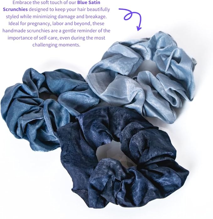 - PAMPER WITH LUXURY AND CARE: Embrace the soft touch of a blue satin scrunchies, a set of three in shades of navy, denim, and steel blue, designed to keep your hair beautifully styled while minimizing damage and breakage. Ideal for pregnancy, labor and beyond, these handmade scrunchies are a gentle reminder of the importance of self-care, even during the most challenging moments. Their smooth satin texture helps preserve the health and integrity of your hair, making them a must-have accessory for every new mom.