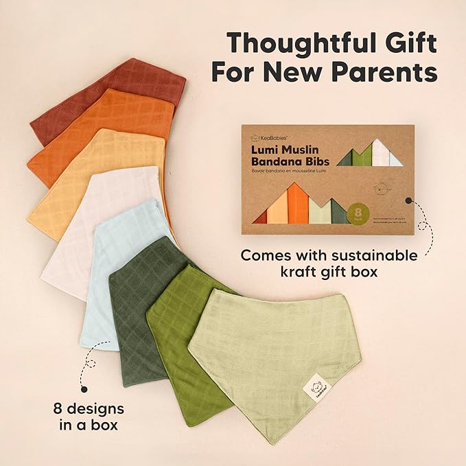 - Ideal Baby Gift - The 8-Pack Lumi Muslin Organic Baby Drool Bibs come beautifully packaged in a sustainable kraft box, making them a cute and thoughtful present for baby shower, baby registry, Christmas, and birthdays.