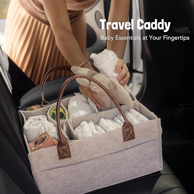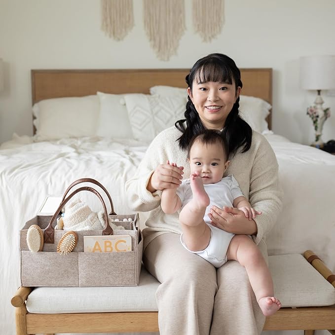 - Baby Caddy Organizer With Customizable Hang Tag: Built tough, styled chic. Our caddy organizer is designed to weather motherhood's adventures with style. Crafted from premium thick felt and adorned with quilted PU leather handles, it offers both strength and refinement.