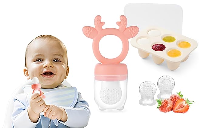 - Teething Design : baby fruit feeder , is also a teether toy, feeder ridges ,with silicone material , provide for a smooth massage for teeth and gums .It is safe for babies try different fruits,foods without worrying about choking ,perfect for teething and self feeding.
