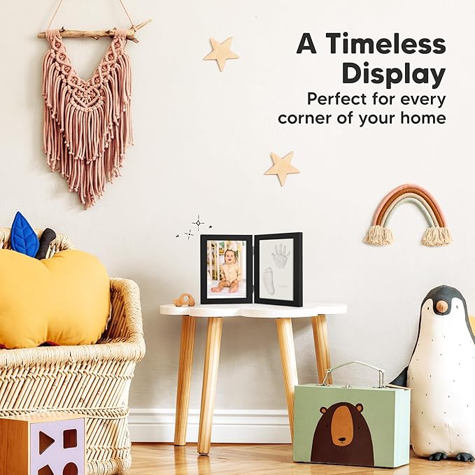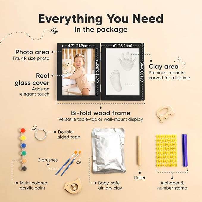 - All-in-one Baby Handprint and Footprint Kit - An elegant bi-fold Rune wooden frame with real glass cover, baby-safe air-dry clay, a wooden roller, alphabet stamps, paint and brush for personalization, and double-sided tape to keep it all in place.