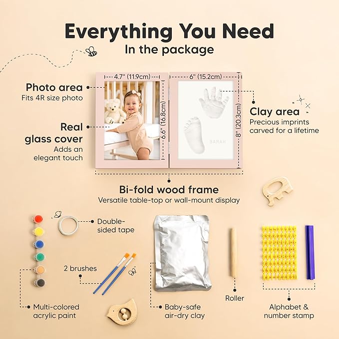 - All-in-one Baby Handprint and Footprint Kit - An elegant bi-fold Rune wooden frame with real glass cover, baby-safe air-dry clay, a wooden roller, alphabet stamps, paint and brush for personalization, and double-sided tape to keep it all in place.