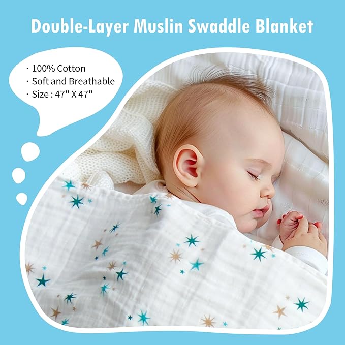 - đăSOFT MUSLIIN SWADDLE BLANKETăWhen comes to a welcome baby gift, swaddle blanket is the most popular one. Our muslin swaddle blankets is made of 100% cotton, breathable, comfortable, and skin-friendly to baby skin. With a size of 47" X 47", it is large enough to easily wrap a baby. It can also be used as a receiving blanket, cuddle blanket, nursing cover, sunscreen for strollers, burp cloth, car seat cover, play mat, changing pad, or mini crib sheet.