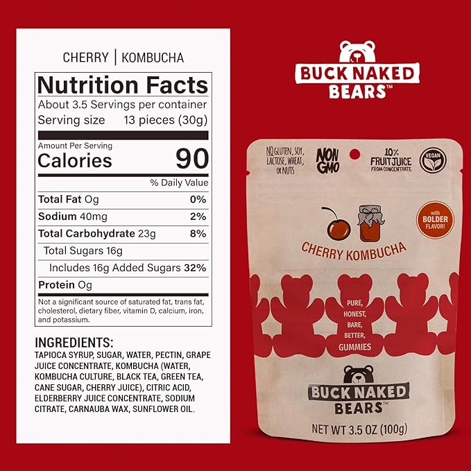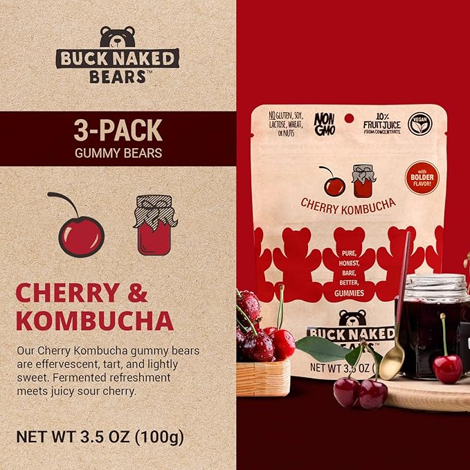 Buck Naked Bears - Cherry Kombucha Gummy Bears - Soft, Smooth, and Sweeter Like a Fruit Snack - Plant-Based Gummies Good Snack Choice - Non-GMO - Clean Label Gummy Candy, Vegan - 3.5oz 3-Pack